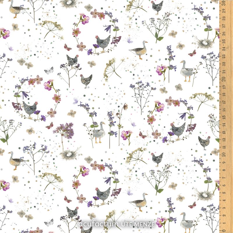 Der Baumwollstoff Landhausromantik vereint die behutsame Schönheit des Landlebens mit zarten, handgezeichneten Motiven von Kerstin Heß. Zwischen feinen Frühlingsblüten, filigranen Zweigen und sanften Farbtupfern begegnen uns kleine Gänse und Hühner, die eine ruhige, naturverbundene Stimmung in das Design bringen.